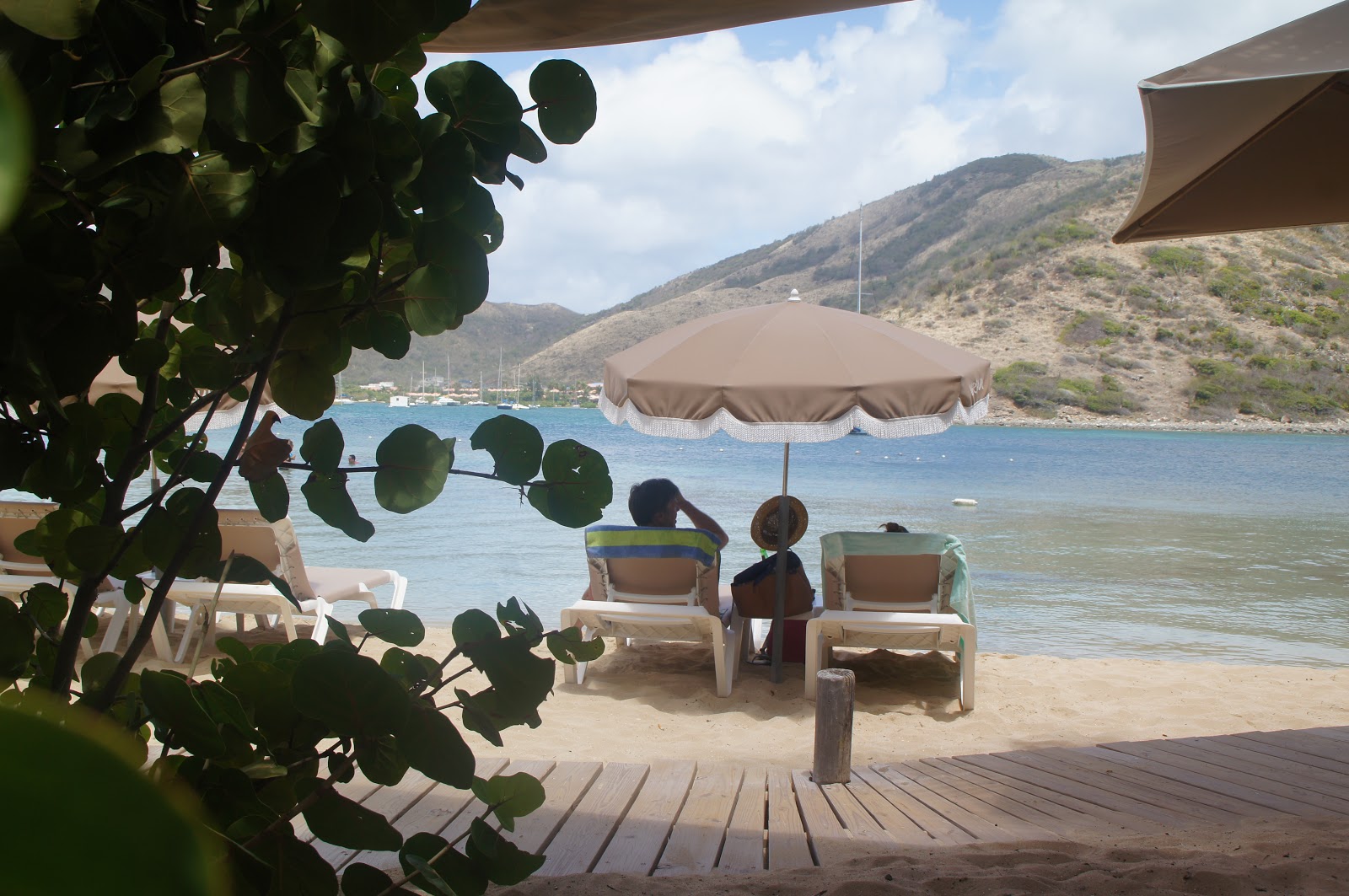 Two visitors to Pinel sit near the Karibuni Beach Bar.