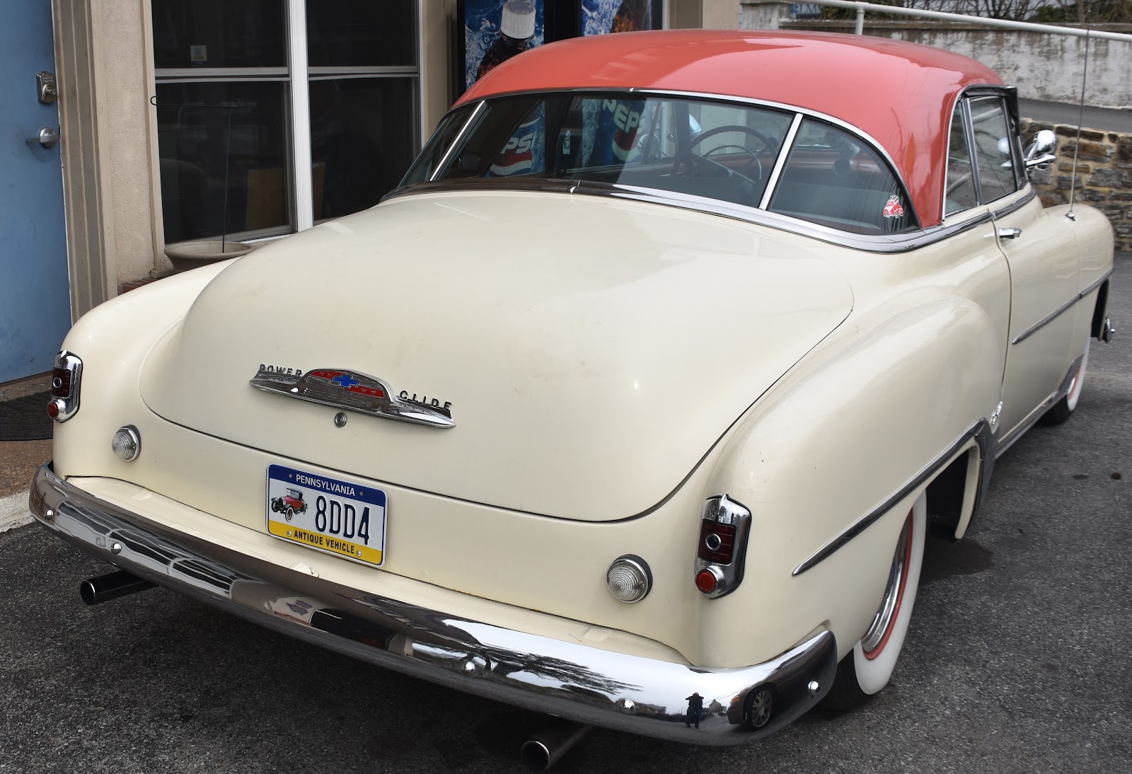 It was an ordinary day. Headed east on Route 23 toward the Shady Maple Restaurant when I saw it out of the corner of my eye. Sitting in front of a bodyshop was this beautiful 1952 Chevrolet Coupe with chrome that caused the sunlight to reflect off the bumpers right back at me. I assumed that it had been in the body shop for some work and the beautiful paint job reminded me of the two-tone beach white and bittersweet colors that a friend of mine used to have when we were both in college. Just had to turn around and take a better look at it before continuing along my journey.